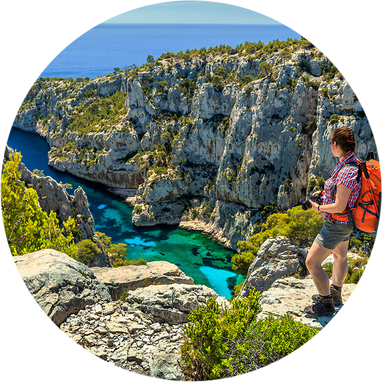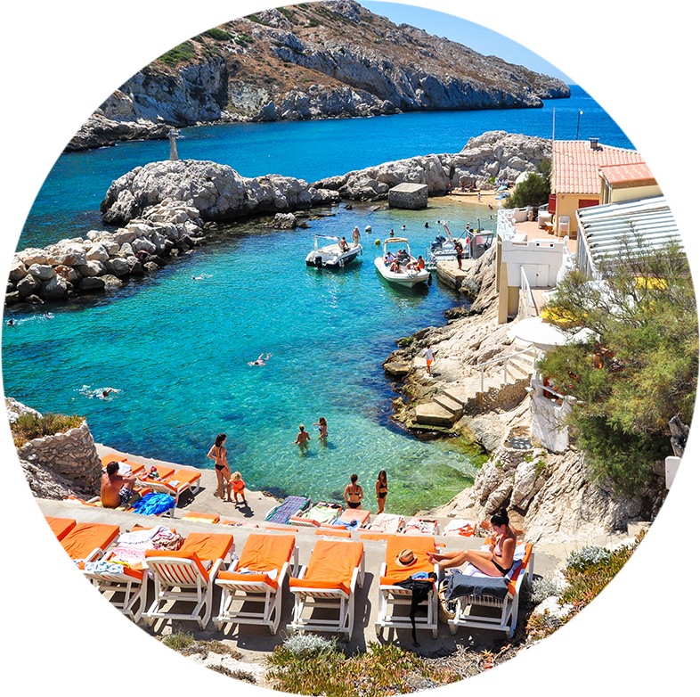 En zodiac, embarquement au Vieux-Port de Marseille face à l’Hôtel-de-Ville pour la découverte de toutes les Calanques de la Côte-Bleue entre l’Estaque et Carry-le-Rouet, arrêt baignade possible puis retour au Vieux-Port.